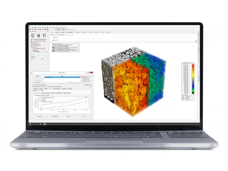 O módulo GeoDict BatteryDict foi desenvolvido para simular propriedades eletroquímicas e estruturais de eletrodos utilizados em baterias de íons de lítio, sódio e tecnologias avançadas.